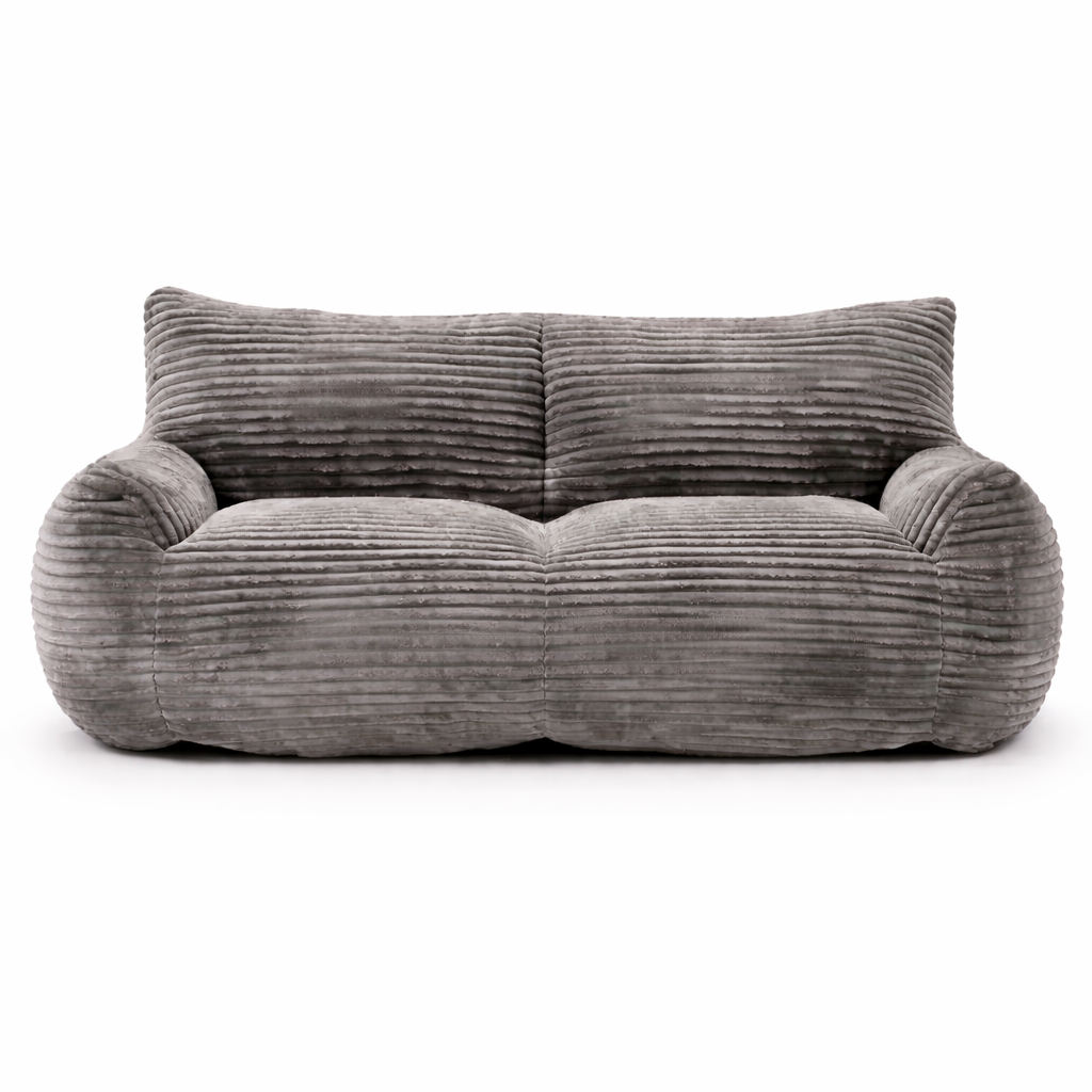 Le produit est recouvert d’un tissu texturé à côtes et présente une structure souple sans armature rigide. Il est conçu comme un élément d’assise indépendant pouvant être déplacé selon les besoins.